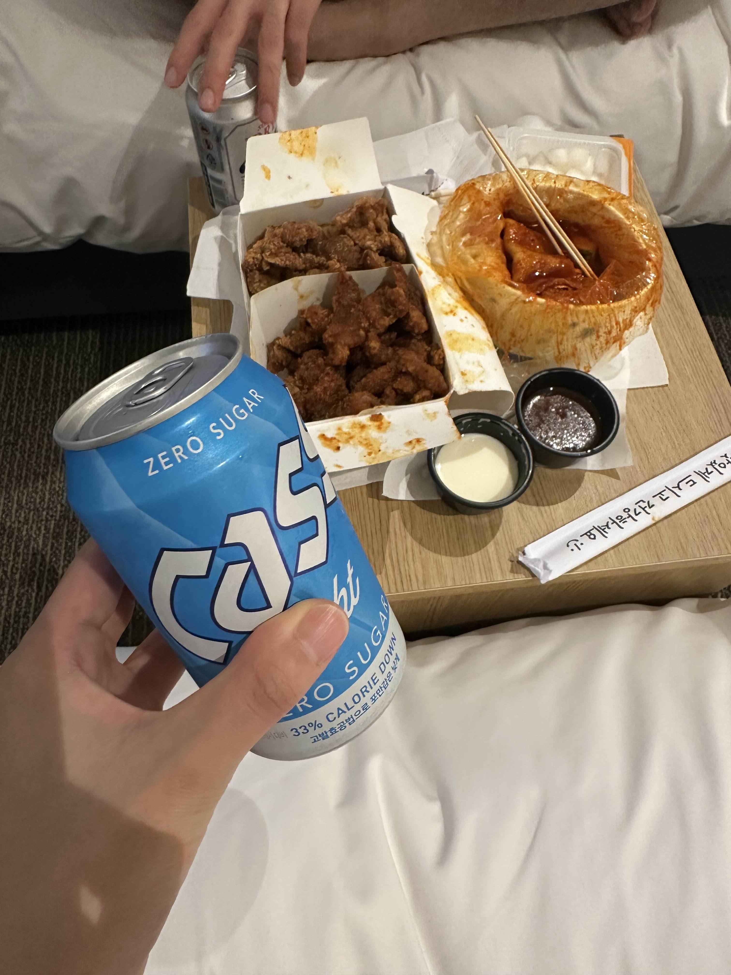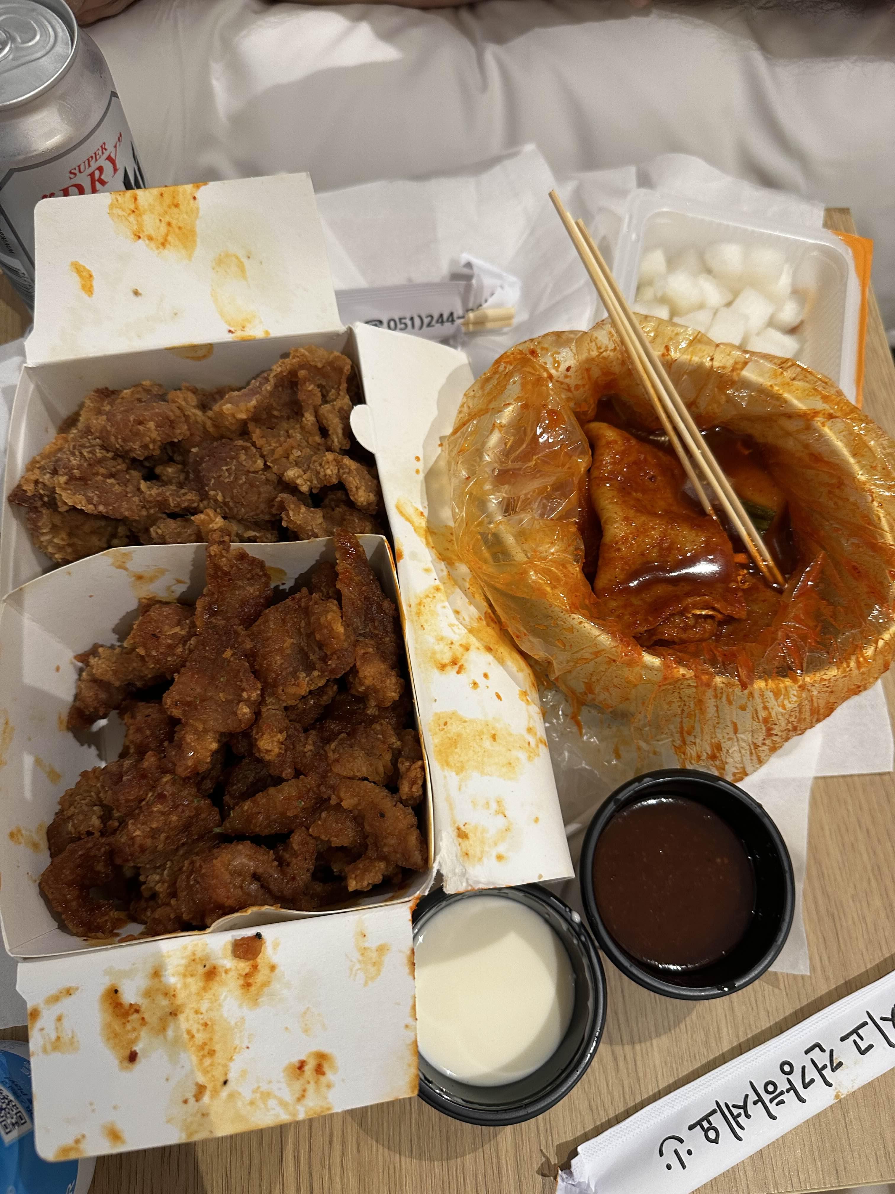 그리고 궁금했던 돼지갈비튀김 깡돼후랑 유명한 떡볶이 포장해서 숙소에 갔다.